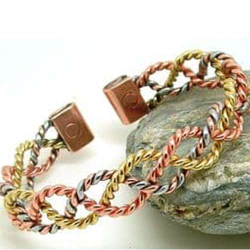 An attractive design made from twists of copper, and brass strands laced together with a copper and aluminium strand to give a tri-colour look, finished in an open plaited.