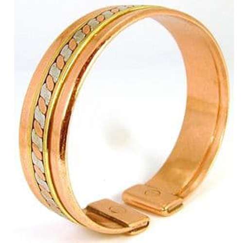 An attractive design, Copper, Aluminium twisted and flattened into the perimeter with brass rolled inlayed into copper bracelet.