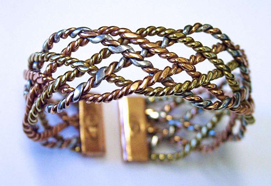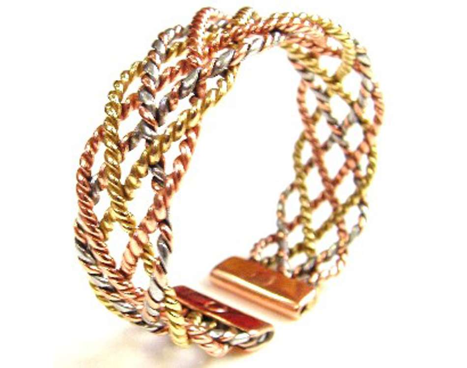 An Elegant three colour laced design woven with the brass, copper and Aluminium strands twisted  into themselves and then laced across each other thereby creating a very attractive tri-coloured bangle / bracelet .