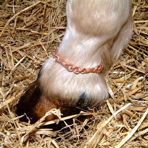 Images show this unique chain bracelet on our 16hh Stallion THE PRESIDENT. It Is Superbly Crafted and Hand Finished in the UK using only the finest materials. This coronet / chain uses expertly formed pure copper with 4 sets of high strength Neodymium Magnets which have then been expertly flattened and finished, concealing them safely. These quality made to measure chains are the ideal way of introducing your pet to magnetic copper therapy. The chain is made from 99.9% pure copper, with four or six copper pods containing a neodymium (rare earth) magnets measuring a total of 1700 gauss embedded in them..